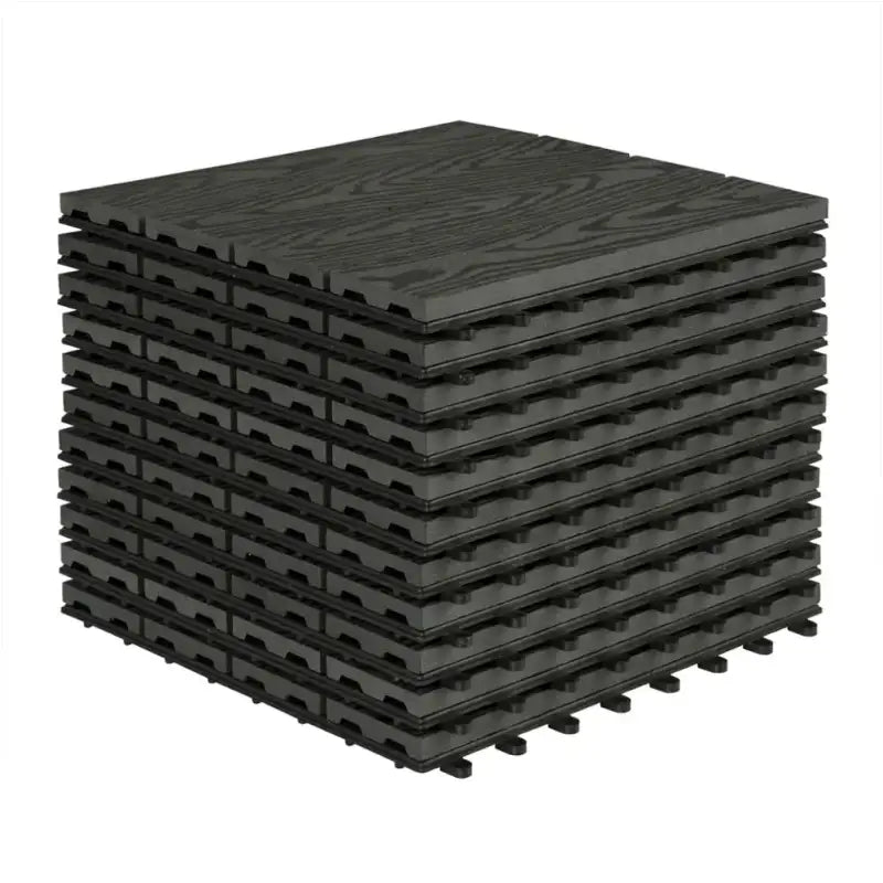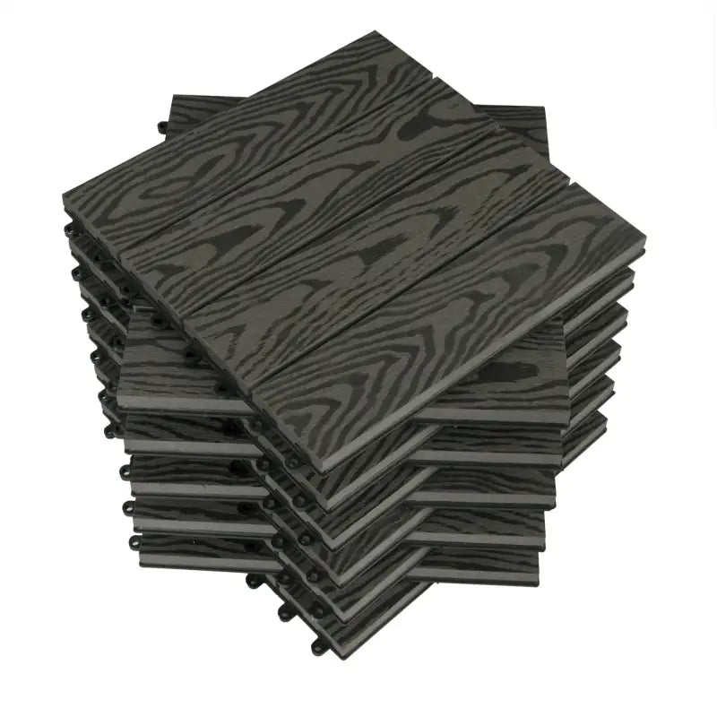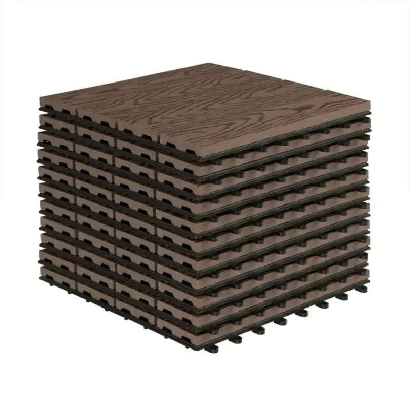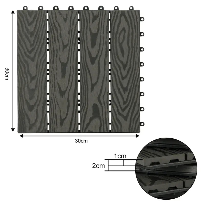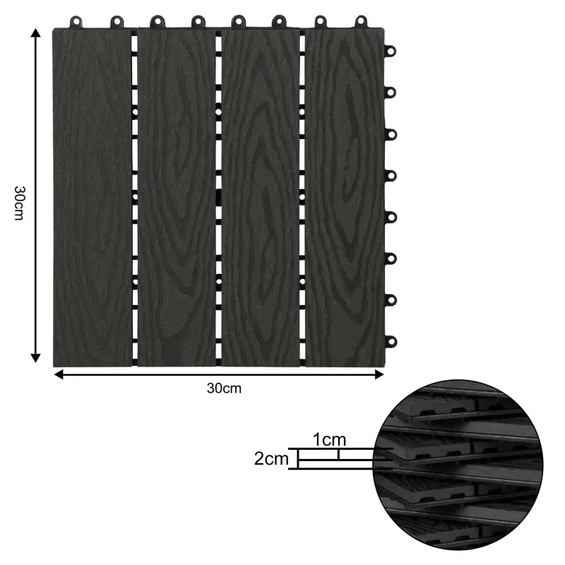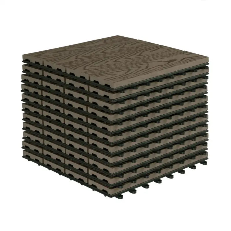 Avec la terrasse BukkitBow, vous pouvez facilement créer une belle surface extérieure à la fois fonctionnelle et esthétique. Ces planches de terrasse sont conçues avec un aspect bois et sont disponibles en différentes couleurs, dont anthracite, gris, marron et café. Chaque carreau mesure 30 x 30 x 2 cm, offrant l'équilibre parfait entre élégance et durabilité pour votre patio, balcon, terrasse, allée ou même votre spa.