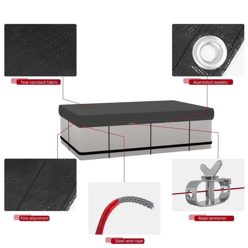 Dank der Aluminiumösen und dem mitgelieferten Stahlseil ist die Installation dieser Poolabdeckung ein Kinderspiel. Mit einem Rand mit Naht und Aluminiumösen im Abstand von 50 cm können Sie das Kabel bequem einführen und die Plane sicher befestigen. Die Abdeckung schützt Ihren Pool nicht nur vor Staub, Blättern und Schmutz, sondern erleichtert auch die Reinigung, sodass Sie mehr Zeit haben, Ihren Pool zu genießen.